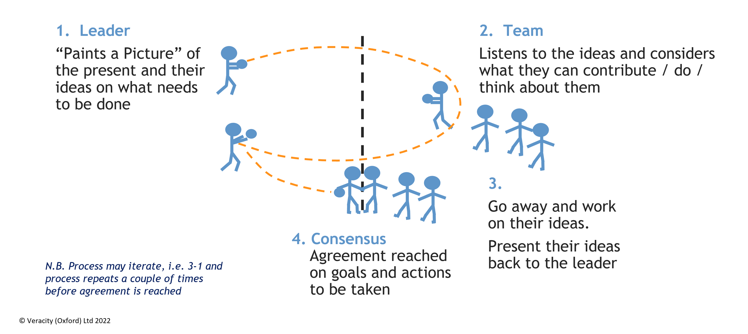 The leader “throws the ball” by describing their ideas for the goals and plans to achieve them.