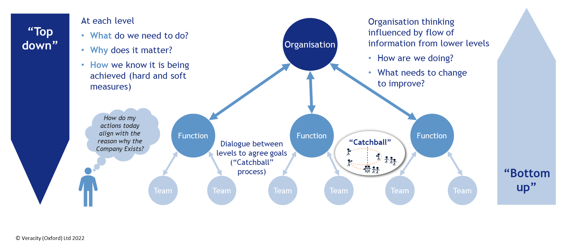 Another significant benefit of this approach is that the goals of the organisation and the personal objectives of the individuals in it are aligned. The questions posed during the ‘catchball’ process will almost certainly reveal those things that really matter to the individuals involved as well as to the organisation.