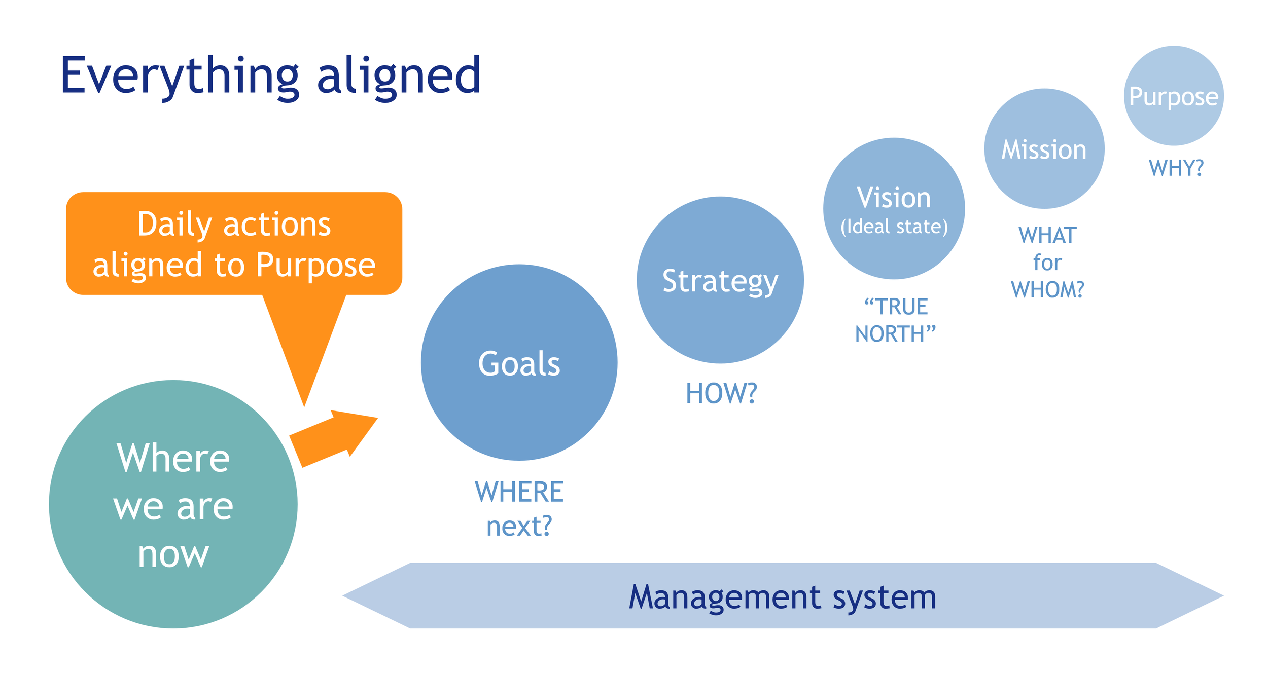Purpose answers the question “WHY do we exist?” beyond making a profit. It is typically value driven, reflecting the core values of the organisation and the impact it seeks to make. Clarity of purpose keeps the organisation focused on delivering customer value, strengthens motivation by clarifying the reason behind the work, and connects individual actions to the bigger picture, building ownership, pride, and a deeper sense of contribution across all levels.
